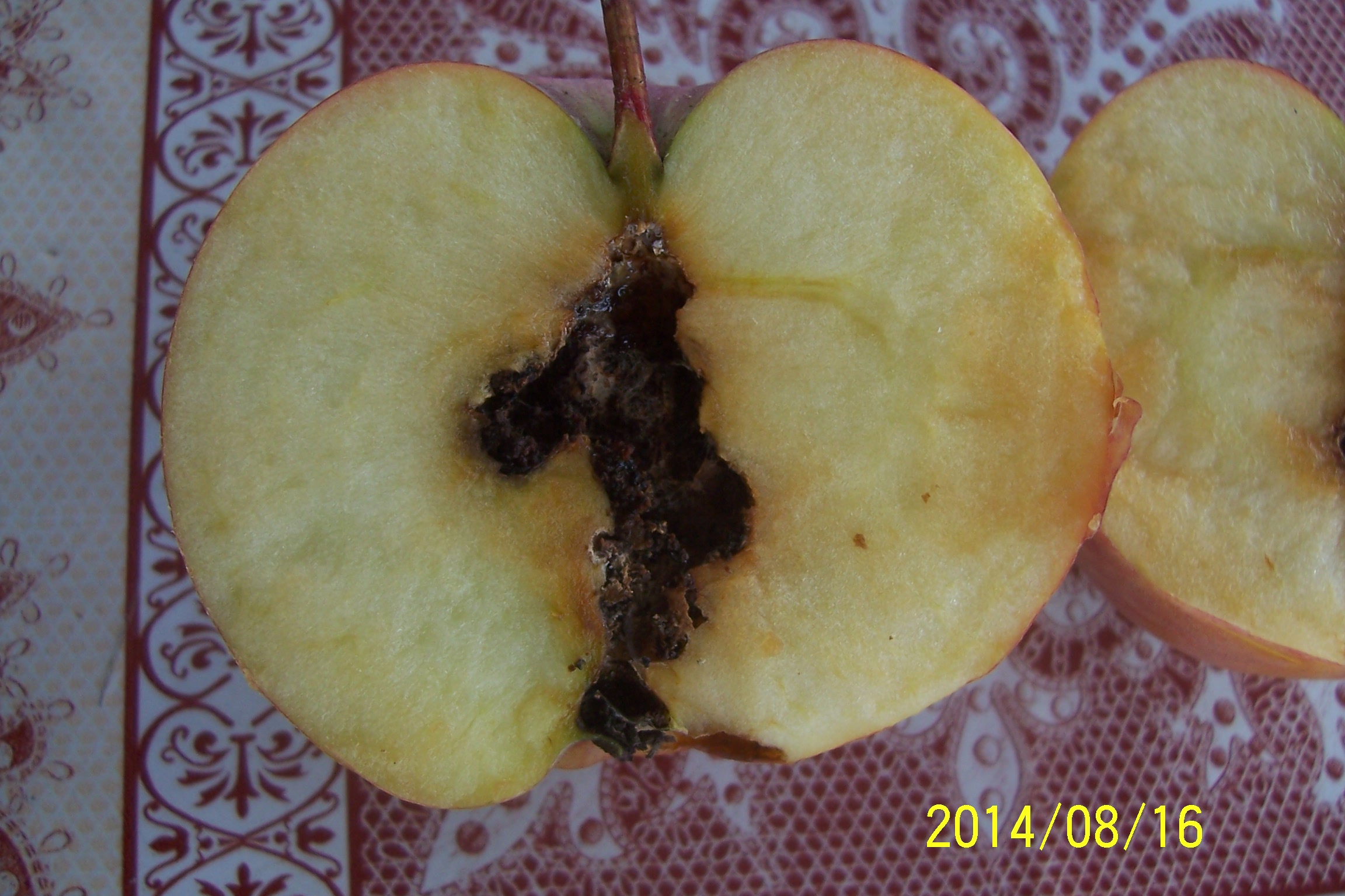 Sajnos hasonló problémával állok Én is szembe, de mivel nem vagyok szakavatott ebben a témakörben, kérném, hogy erősítse meg a mellékelt fénykép alapján, hogy az évek óta tartó alma termés betegségért az almamoly a felelős (amit sejtek, de lehet, hogy gombás betegség). Permeteztem többször is (még virágzás előtt és után is) de sajnos idén is találtam ilyen almát. Van remény, hogy jövőre ne találkozzak ilyen beteg almával? Egyébként sztarking alma fám van, ez érzékenyebb lenne erre a kártevőre, vagy gombára (hogy mindig, jellemzően ezt tapasztalom évről-évre). A másik fán (golden) nem találtam ilyen betegségre utaló jelenséget.
