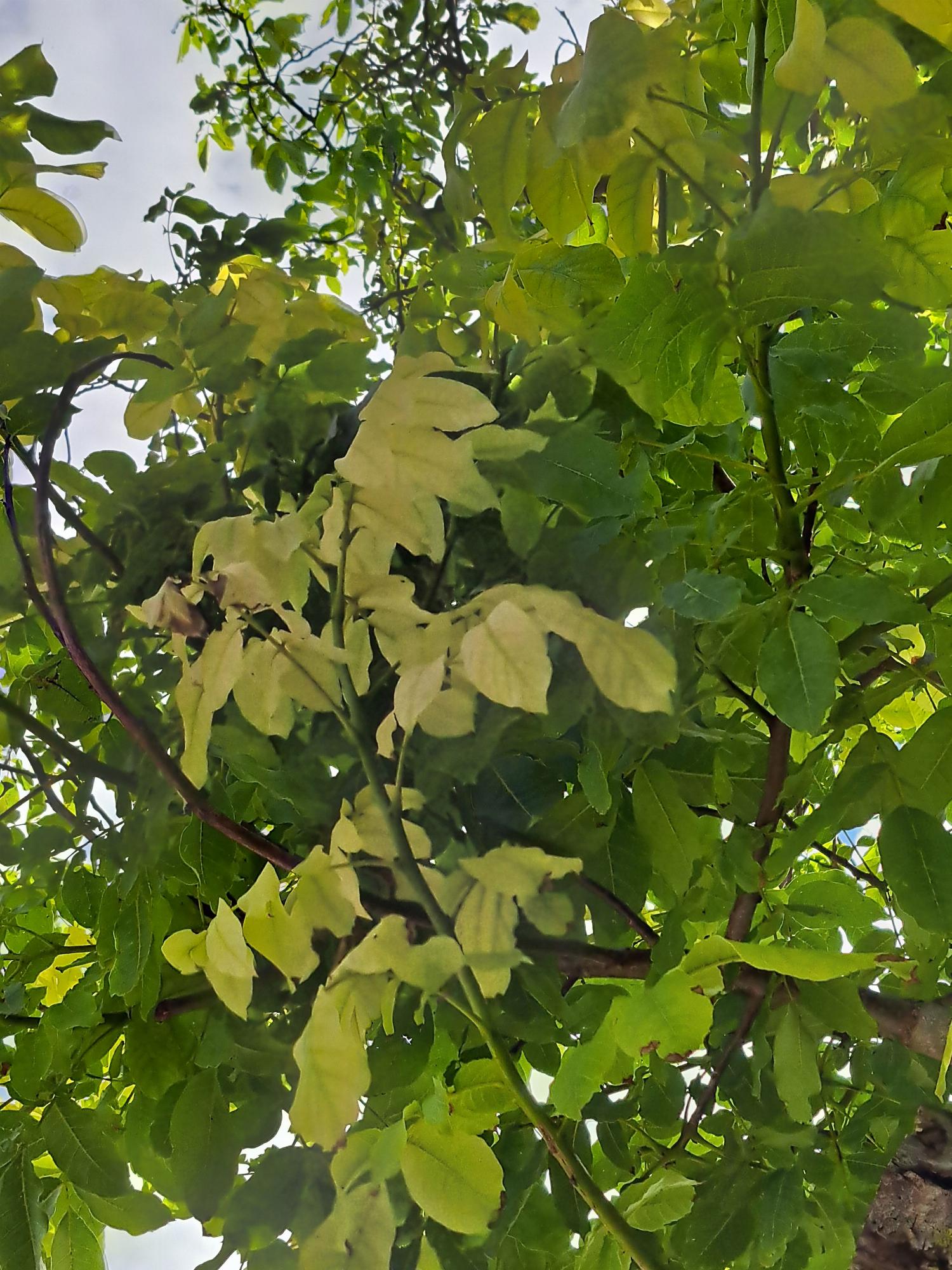 Kedves Boldizsár. Úgy tűnik, hogy vashiányos a diófa. Ennek több oka lehet: magas talaj pH (ezt ellenőzrizni kell), illetve a túzott káliumellátás, vagy a meszes, ill. túlságosan tömörödött talaj. Ennek utána kell járni talajvizsgálattal.
