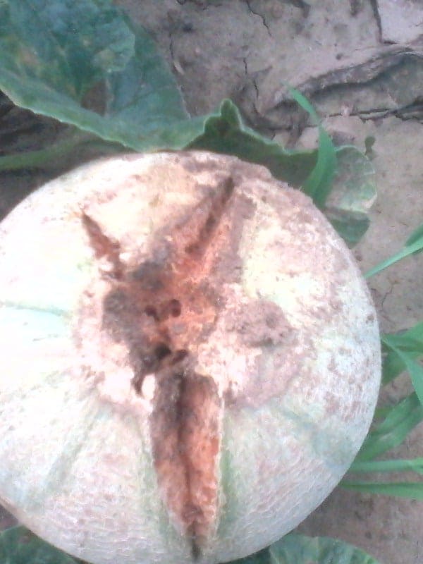 Először is elnézést kérek a megcsúszott válaszért. A kérdésére visszatérve a képen látható tünetegyüttes: repedés és némi rágás. A repedés hátterében egyenetlen folyadékutánpótlás áll (pl. hosszabb száraz periódus után nagyobb esőzés), mely valószínűleg párosult az érés-közeli állapottal. A sárgadinnye töveket, amikor eljön az ideje minimum 2 naponta át kell nézni, hogy beértek-e. A rágás, sajnos zűrösebb.Nagyon sok élőlény csigák, rágcsálók szeretik a lédús termést, mely közvetlenül érintkezik a talajjal, így könnyen megrághatják. Tisztelettel és üdvözlettel: Kis Krisztiánné Mariann
